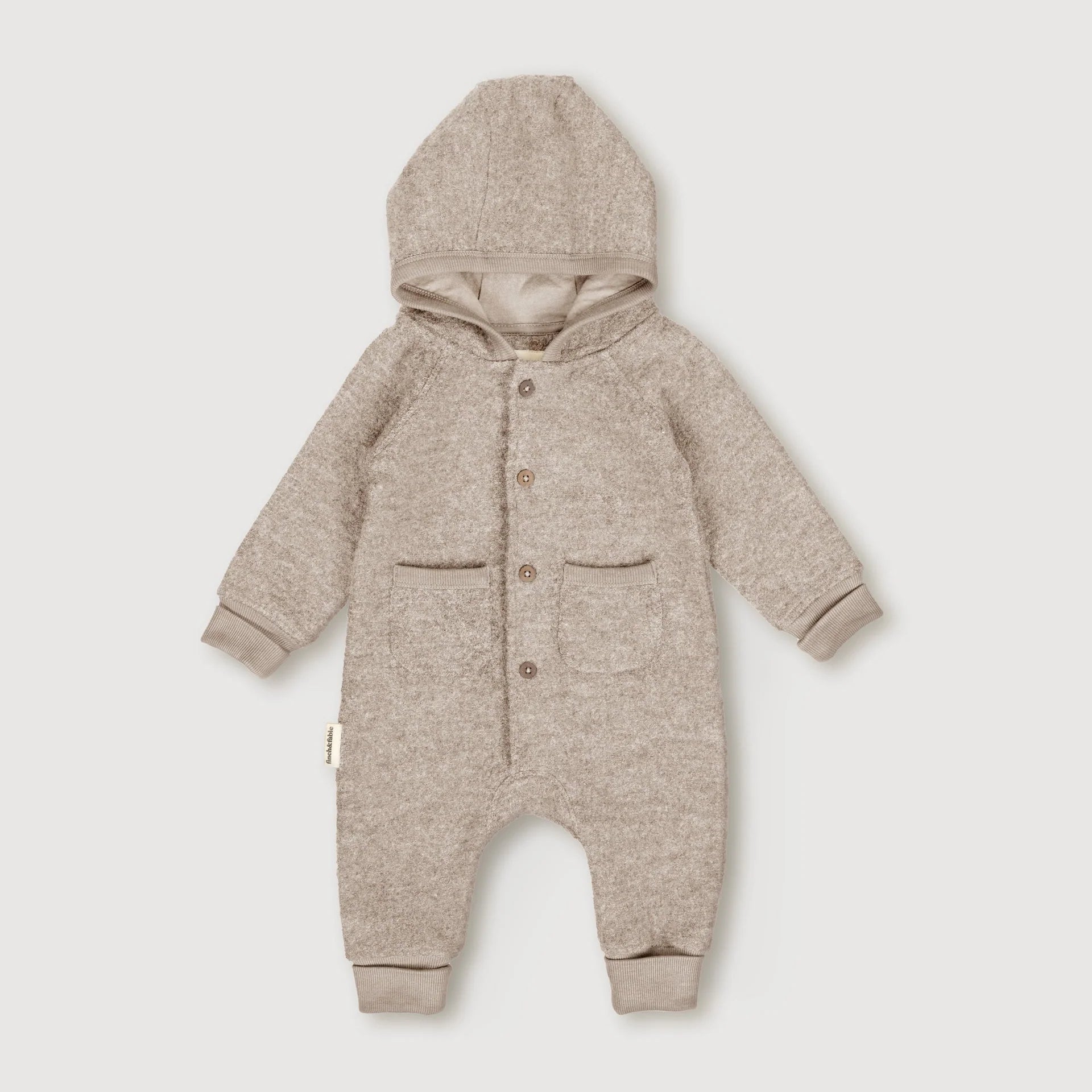 This wool one-piece is made from super soft & stretchy merino wool to provide warmth and protection when outside and exposed to the elements. This merino wool one-piece has a button down closure for easy on and off, and extra large rib cuffs to cover baby's hands and feet. Functional pockets. Match with our wool booties and wool neck scarf for a complete outfit.
