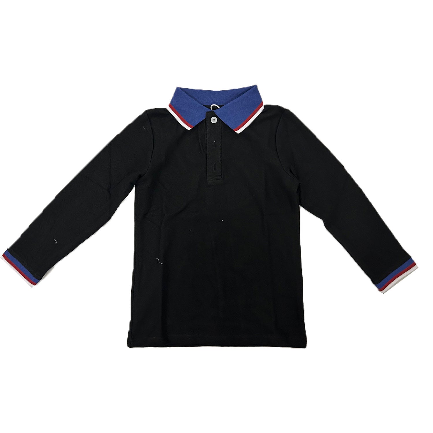 Introducing the Bopop Blue white Red Collar Boys Polo LS - Black, a stylish and versatile addition to your child's wardrobe. Made with high-quality materials, this polo shirt features a classic design with a pop of color on the collar for a touch of fun. Perfect for any occasion, this shirt offers comfort and style in one package.