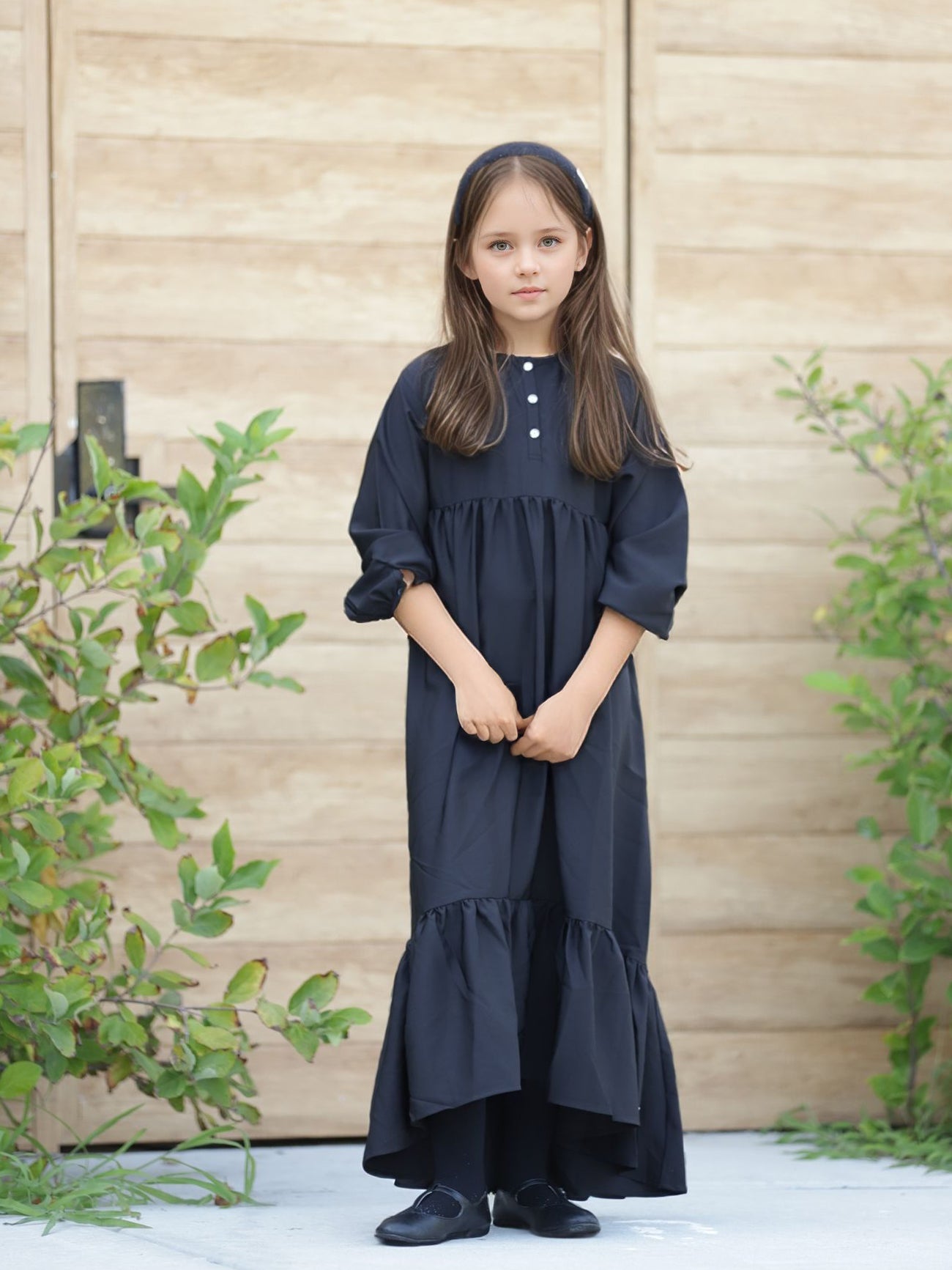 Elevate your child's wardrobe with the Retro Kid Mae Maxi Dress in classic black. Featuring elegant jewel buttons, this dress combines timeless style with refined detailing. Its maxi length offers graceful movement and a sophisticated silhouette, perfect for special occasions or everyday charm. Crafted for comfort and durability, it ensures your child looks polished while feeling at ease.