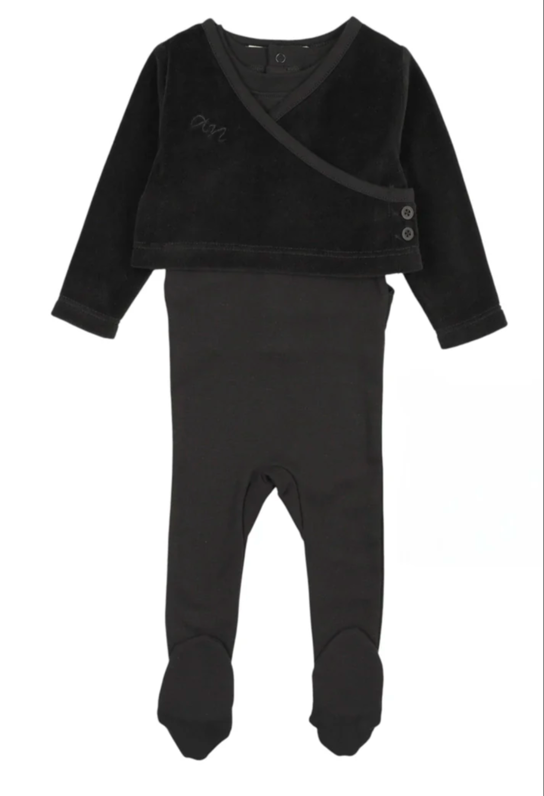 This Ann Of Nan black footie with matching velour vest offers a refined blend of comfort and style. Crafted for softness and warmth, the footie provides cozy coverage, while the velour vest adds an elegant layer, perfect for cooler days. Ideal for layering, this duo supports easy dressing and ensures your little one stays snug without restricting movement. Designed with attention to detail, it suits discerning parents seeking both quality and sophistication in infant wear.