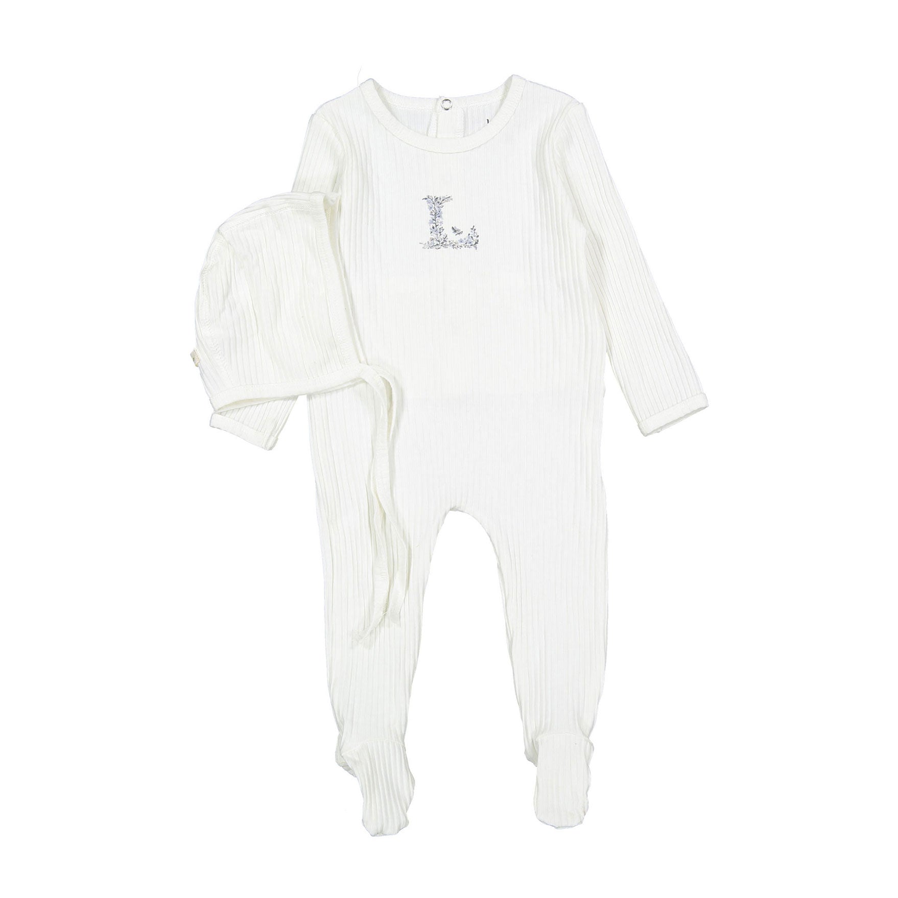 Ladida Ivory Ribbed Footie & Bonnet - Blue "L"