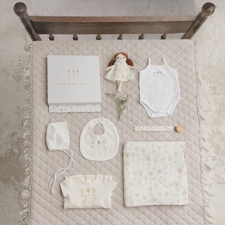 *Includes Footie + Bonnet + Swaddle + Paci Clip + Bib + Onesie + Doll