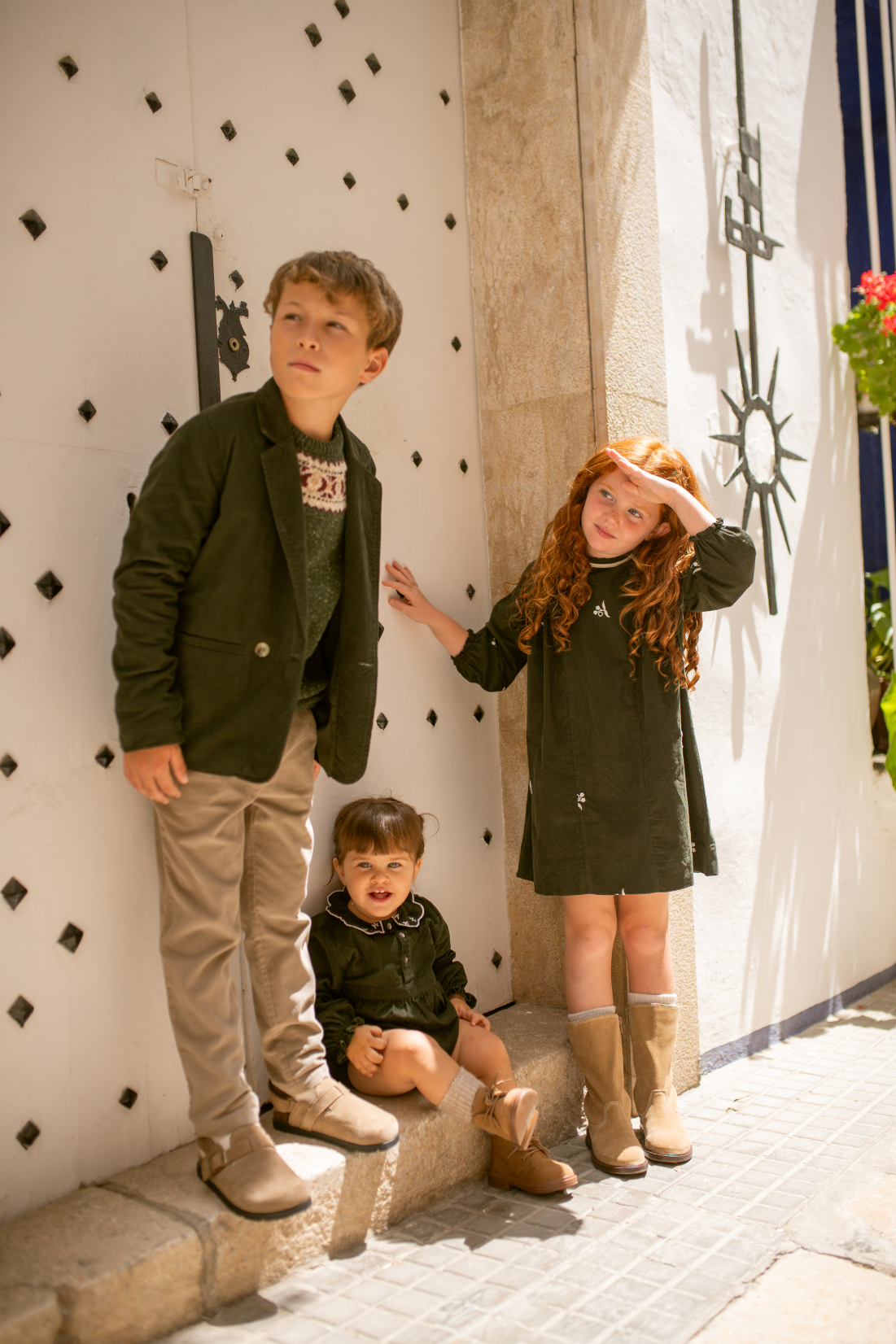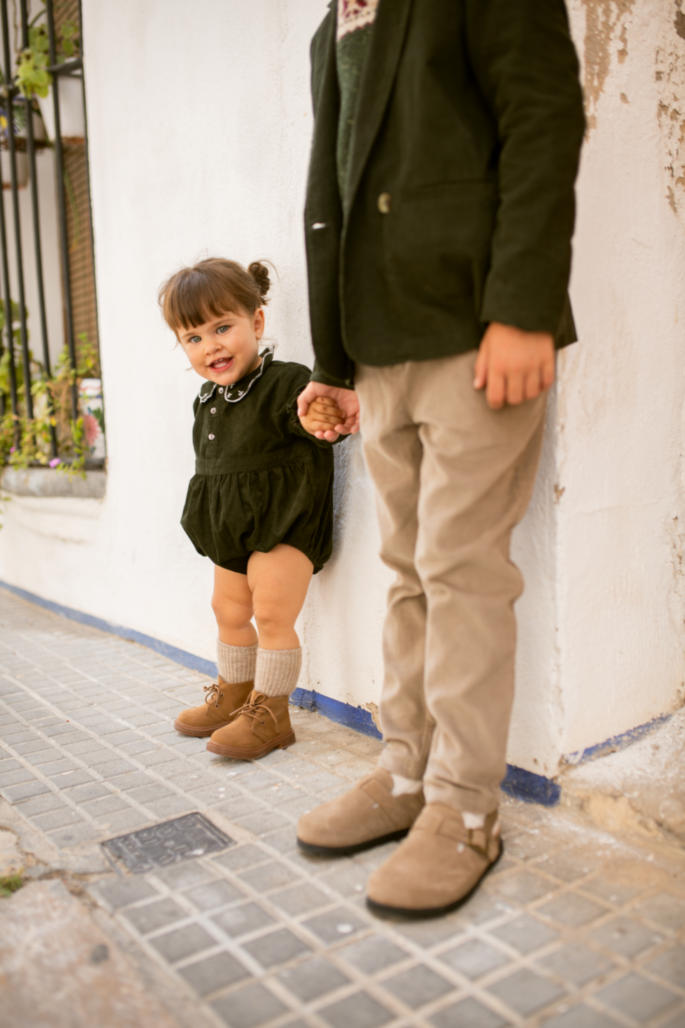 Crafted from soft corduroy, this Orange Dimanche baby girl romper in green offers durability and comfort for delicate skin. Its classic design ensures ease of dressing while providing warmth, making it an ideal choice for cooler days. The romper's tailored fit supports movement and everyday play, combining practicality with timeless style.