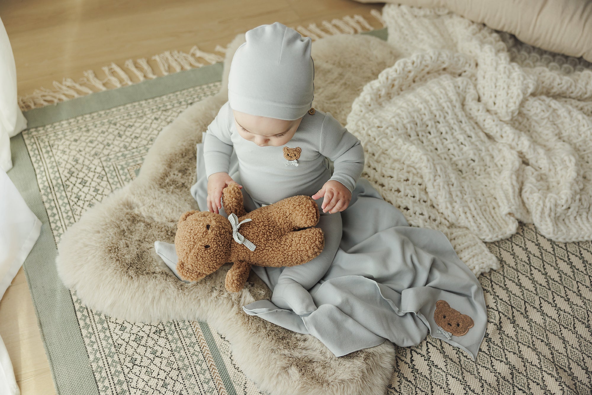 The Lilette Bear Applique Footie and Hat set in pale blue offers gentle warmth and comfort for your baby. Crafted with soft, breathable fabric, this coordinated outfit features an adorable bear applique that adds a charming touch. Designed for ease of dressing and all-day wear, it ensures your little one stays cozy while looking effortlessly cute. Ideal for newborns, this set combines practicality with expert attention to detail.