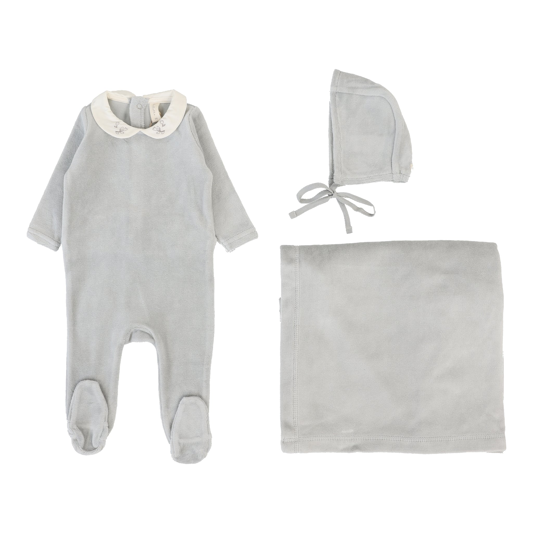 The Lilette Velour Collar Layette Set in Dusty Blue offers a refined blend of comfort and style for newborns. Crafted from soft velour fabric, this set ensures gentle warmth and a cozy feel against delicate skin. Its classic collar design adds a touch of timeless elegance, making it perfect for both everyday wear and special occasions. Ideal for parents seeking quality and sophistication in their baby’s wardrobe.