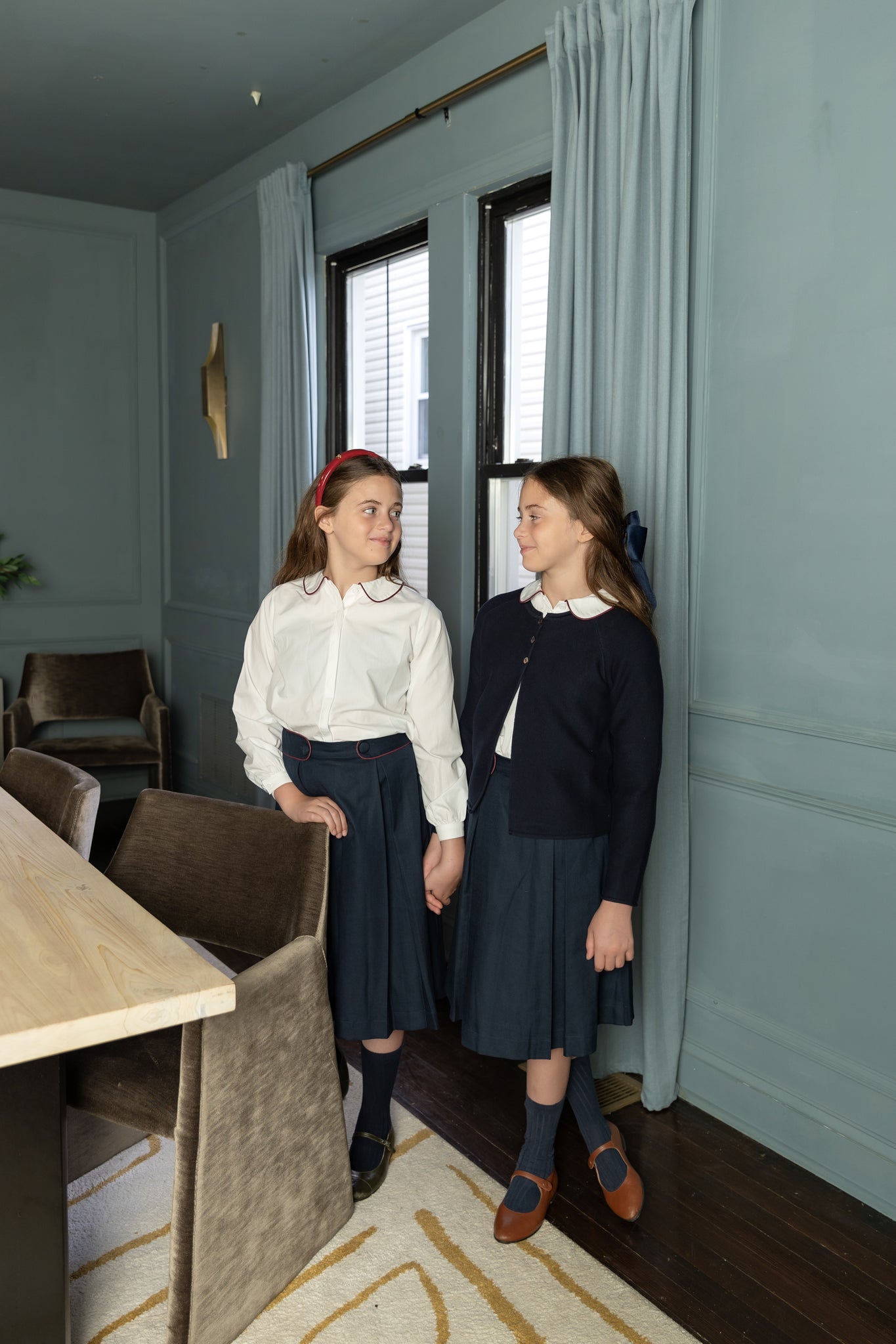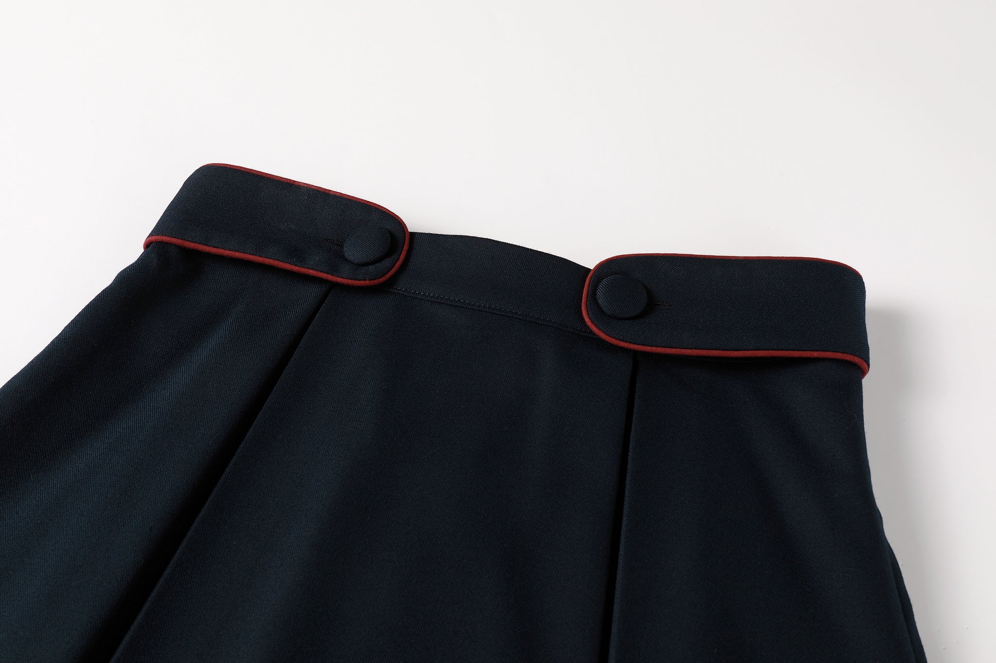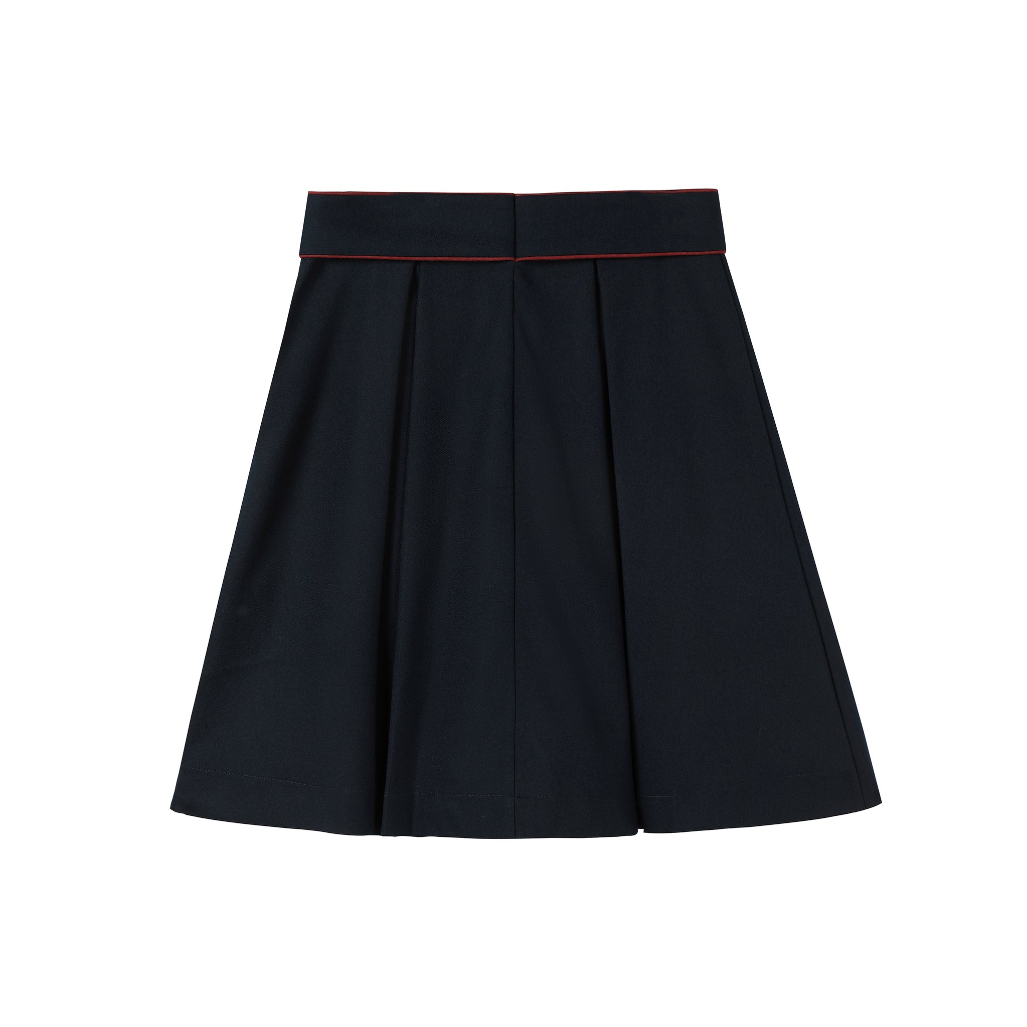 The Nou Nelle Piped Navy Skirt offers a refined silhouette with its tailored fit and subtle piping detail. Crafted for versatility, this skirt pairs effortlessly with both professional and casual ensembles, providing a polished look. Its navy hue ensures timeless appeal, making it a staple piece for a sophisticated wardrobe.