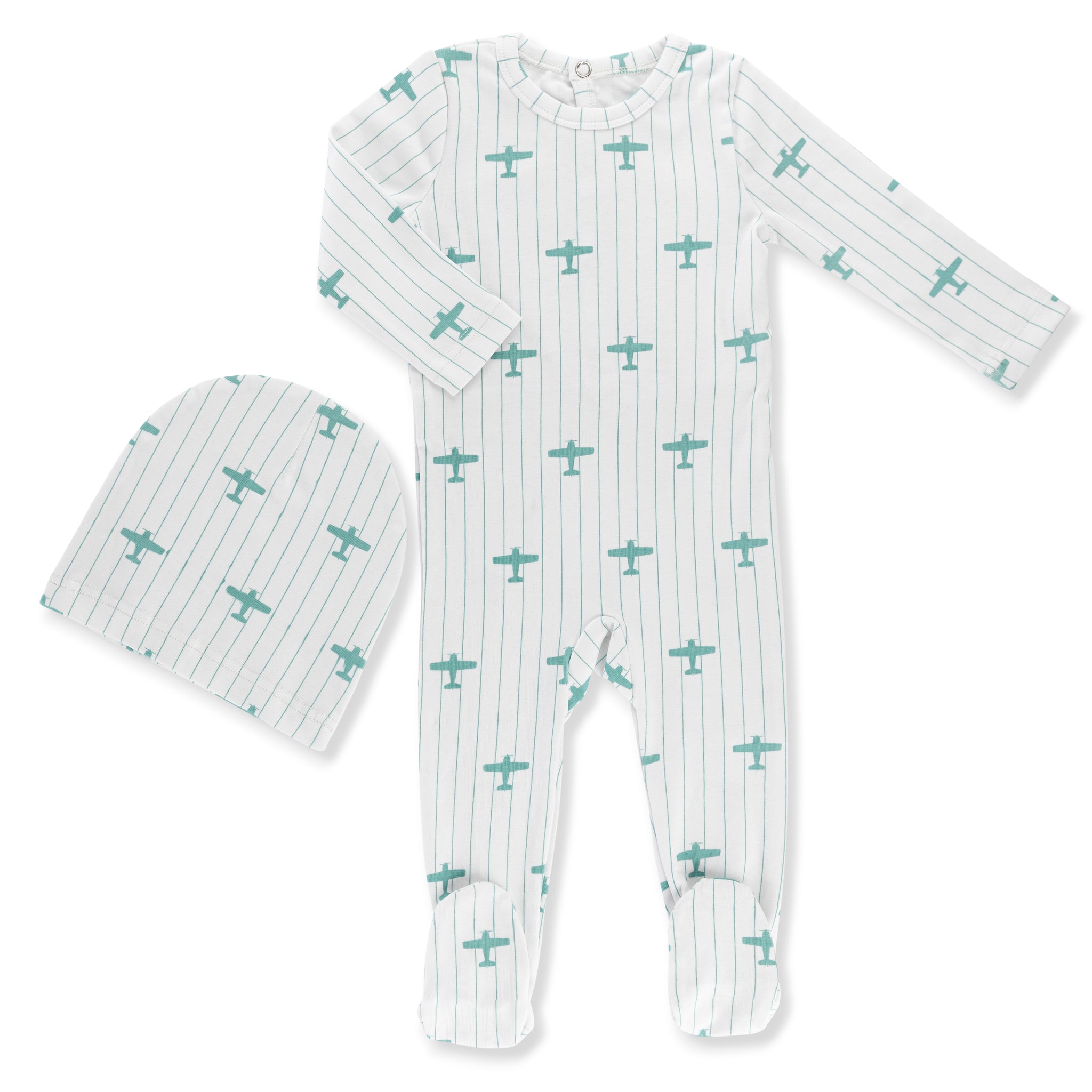 Little Label Blue Airplane Printed Footie & Hat Set - Light Blue