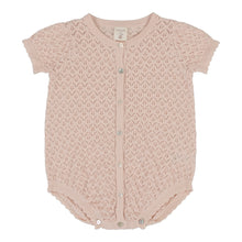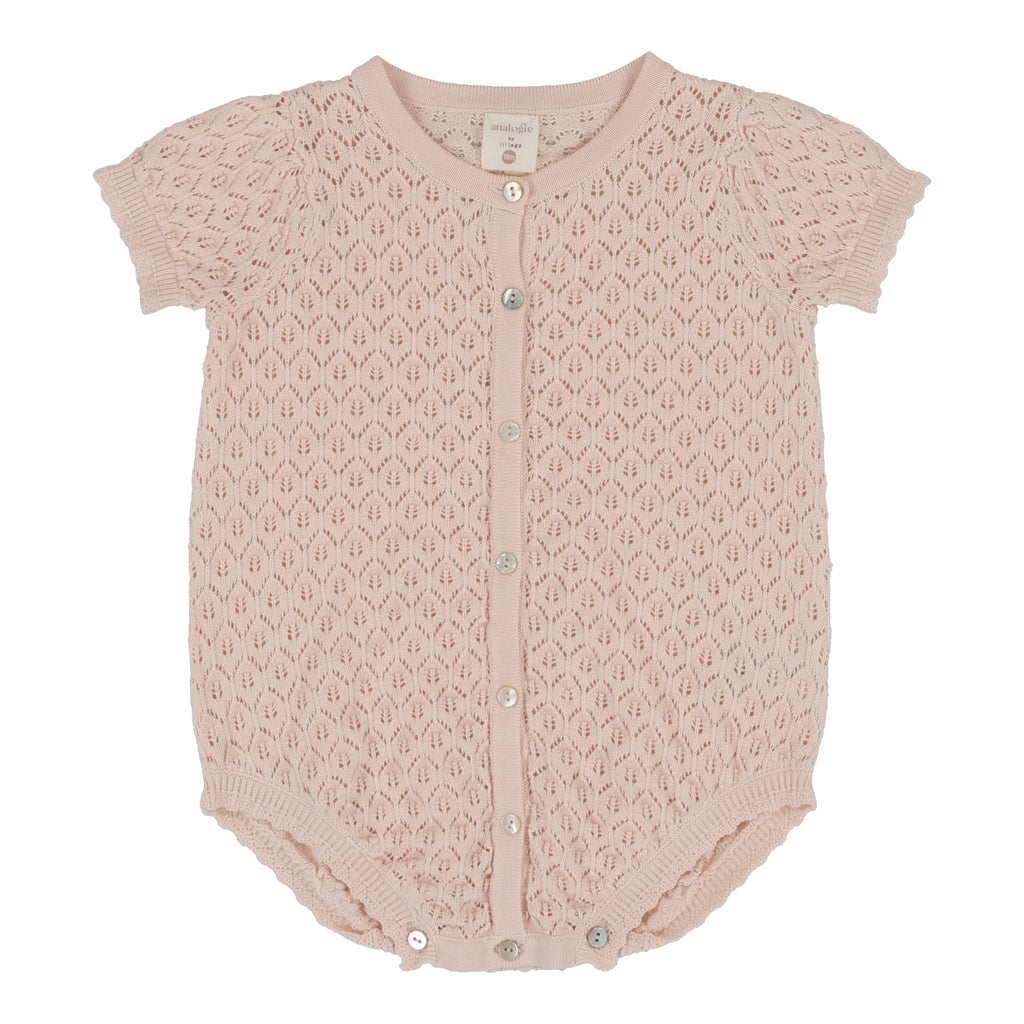 This pearl pink knit romper is the perfect addition to any little girl's wardrobe. Made with soft and comfortable fabric, it provides both style and comfort. Its delicate color adds a touch of sweetness, while its knit material ensures warmth during cooler days. A must-have for any fashionable and practical parent.