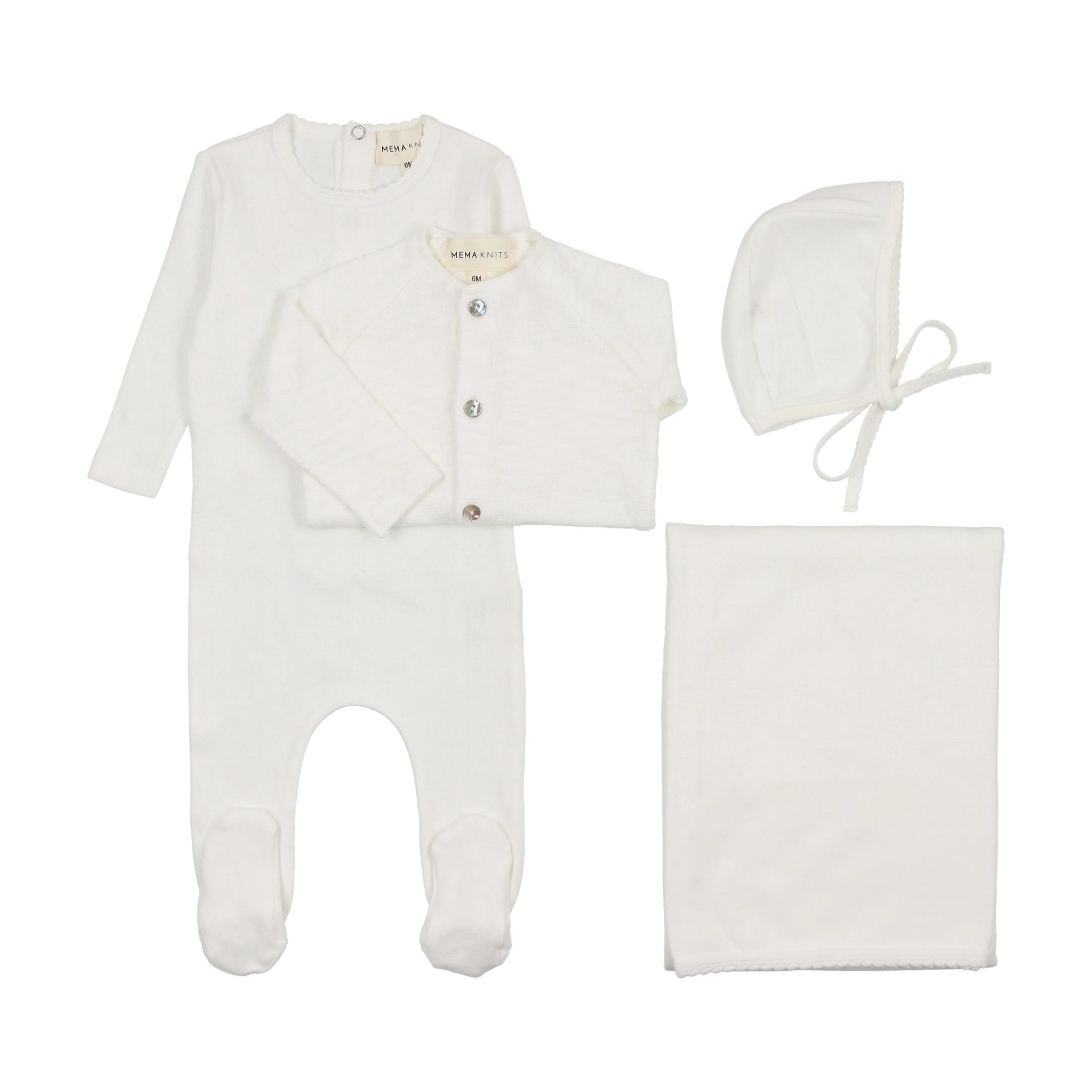 Mema Pointelle Footie Slub Cardigan 4PC Set - White